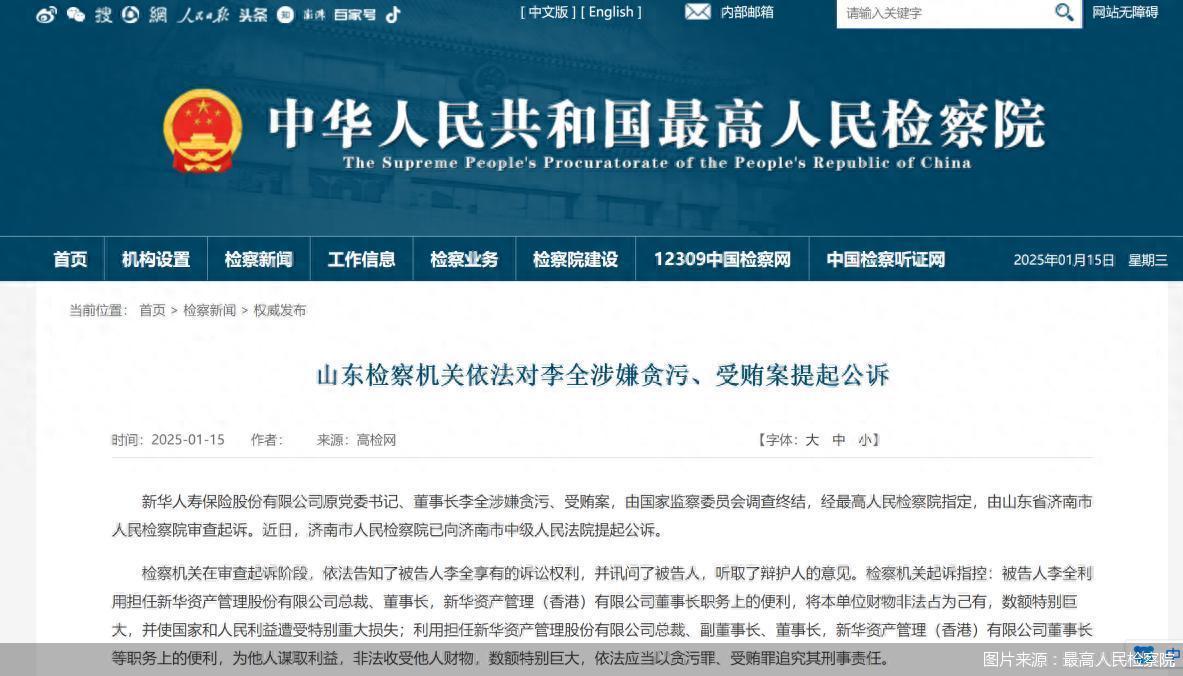 北京商报讯(记者 李秀梅)1月15日,记者从最高人民检察院获悉,新华人寿保险股份有限公司原党委书记、董事长李全涉嫌贪污、受贿案,由国家监察委员会调查终结,经最高人民检察院指定,由山东省济南市人民检察院审查起诉。近日,济南市人民检察院已向济南市中级人民法院提起公诉。