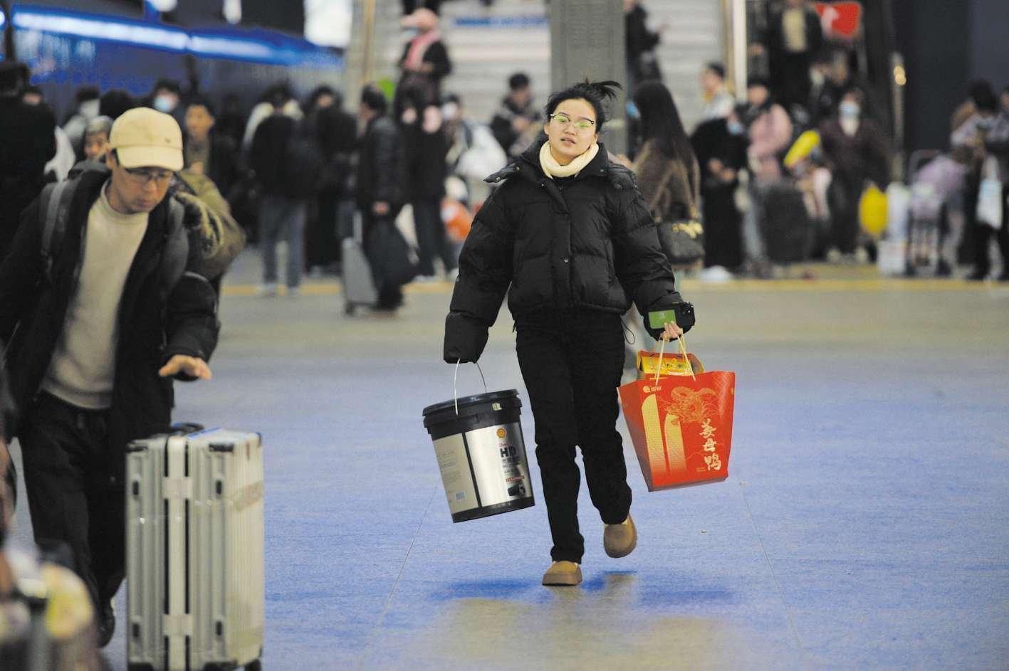 像魏先生一样搭乘“绿皮车”的旅客,返乡行囊可以用“满满当当、五花八门”来形容。有建筑工人拎着白色塑料桶,桶里装着一年在外置办的工具;有年轻的妈妈背着一个孩子,一手拉着行李箱,一手还领着一个孩子,她用手机拍下进站的视频,向手机那头的家人报备行程“已到火车站”;当然,还有更多的“绿皮车”旅客,人手拎着一大袋食物,有泡面、火腿肠、面包、自热锅、薯片,这些方便食品就是他们旅程中的“三餐四季”。
